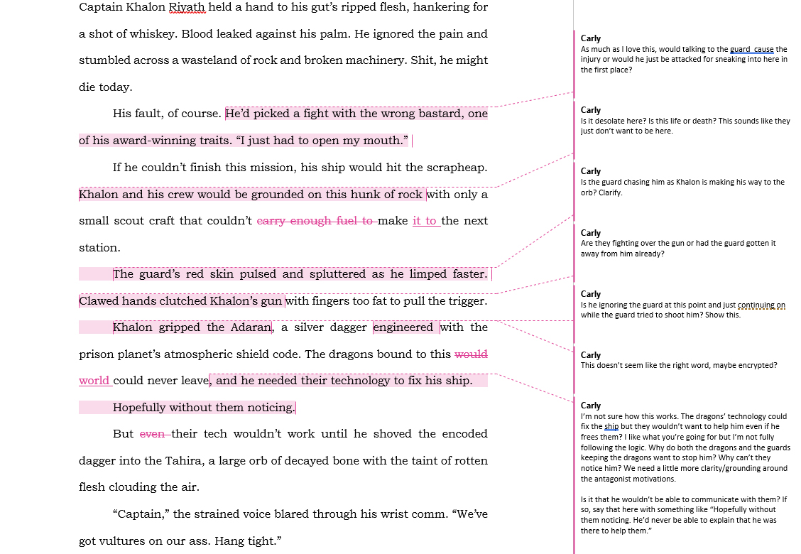 In a random drawing, I was assigned to work with RevPit and Book Light Editorial editor, Carly Hayward. I first met Carly in the RevPit community and for two years in a row, I was dying to submit my manuscript to her. I never did, despite the fact that she likes to read the stuff I like to write. Regardless, we became friends in the community and found a shared loves of space cowboy things that got cancelled way too soon.