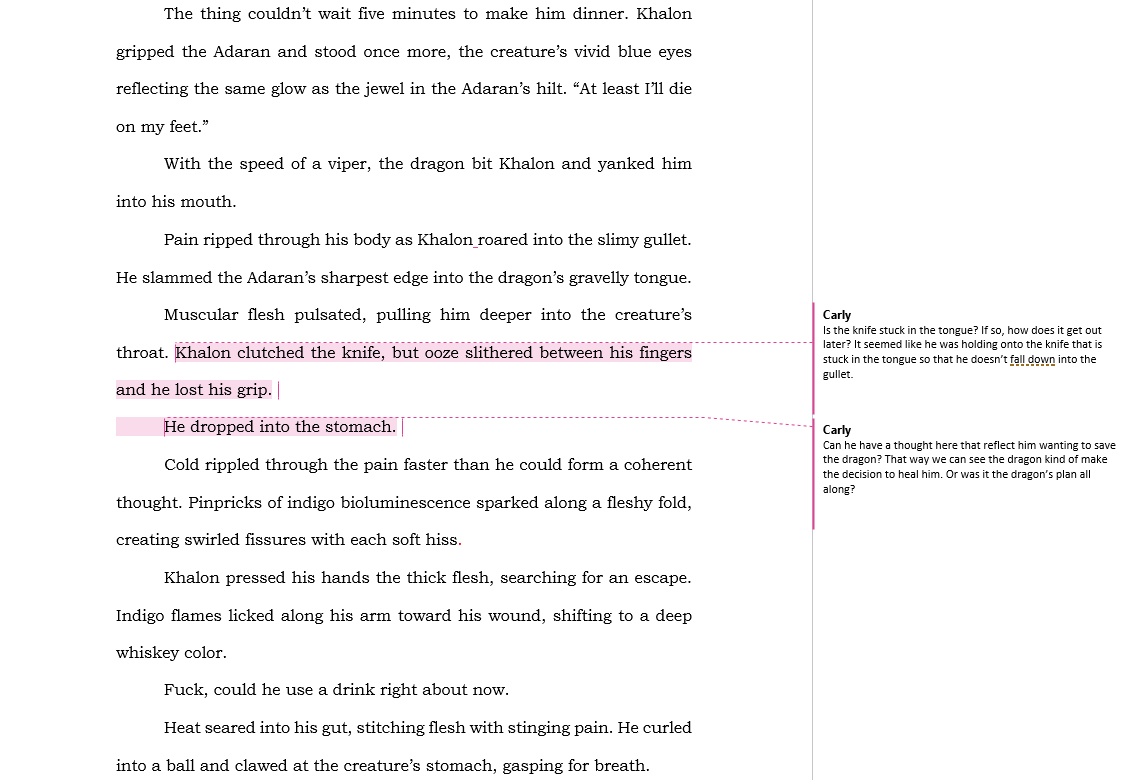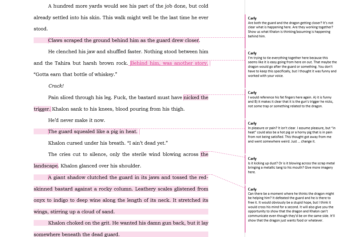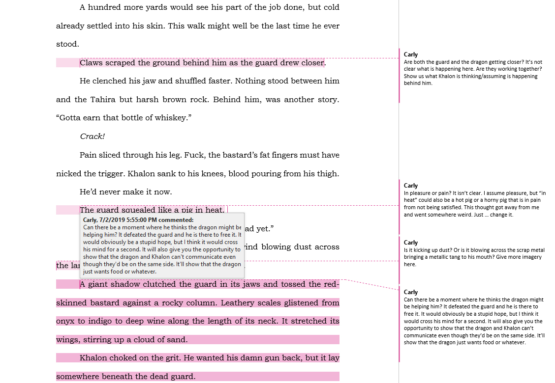 Okay, so I duplicated all of Carly’s edits into a file called ‘Working Copy.’ This enables me to keep the original for reference, but still delete edits as their tackled. For this first pass, I’m going to work directly in Word (as opposed to Scrivener) and fix all the copy edits while deleting the fun, ‘loved this’ comments.